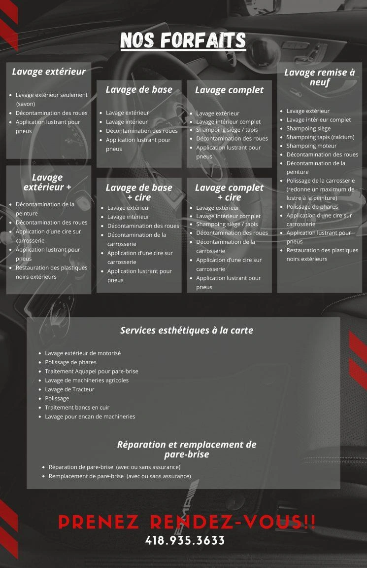En complément, nous proposons des services spécialisés à la carte ainsi que la réparation et le remplacement de pare-brise, avec ou sans assurance. Notre objectif est d’offrir une solution complète, pratique et fiable pour répondre à tous vos besoins en esthétique et entretien automobile, avec un service professionnel et personnalisé.
